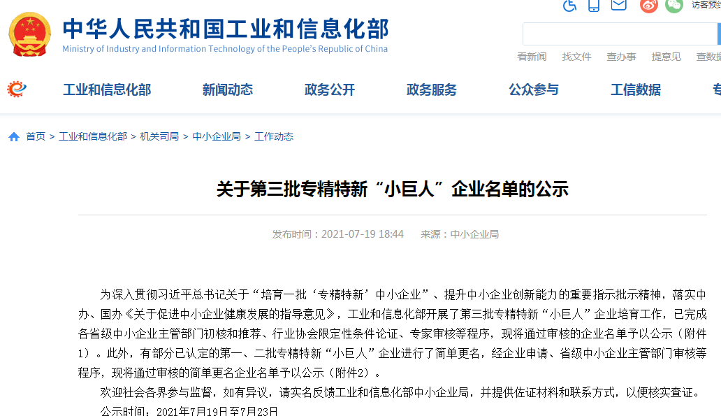 专精特新企业是指具有“专业化、精细化、特色化、新颖化”特征的中小企业,而国家级专精特新“小巨人”是专精特新企业的最高荣誉称号,从省级专精特新“小巨人”企业中筛选,经国家工信部审核确认后发布。